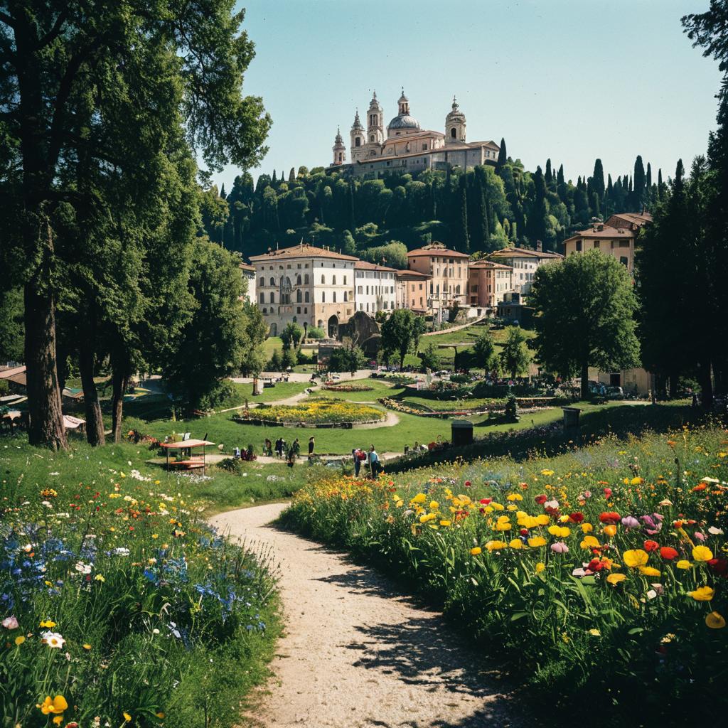 Vfx fantastical, small meadow in the center of the town center, colorful flowers, picnicking families, happy, sunny, mystical, fairytale, photography, realistic, surrounding greenery, nearby path leading to traditional Italian city center, Baroque architecture off to the left side and massive forest to the right, oversized objects, incorrect proportions, above average scale size