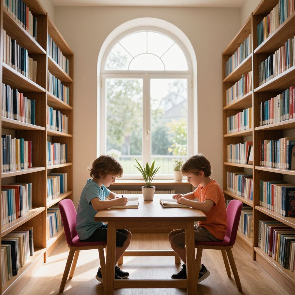 Two children sit at a wooden table surrounded by towering bookshelves, illuminated by natural light streaming through a large arched window that frames a serene outdoor view, as they focus intently on their books amidst a cozy library setting filled with vibrant colors and warm tones.