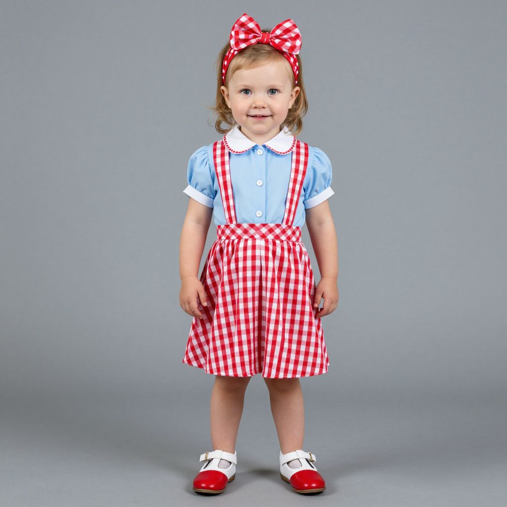 Photograph of a smiling Caucasian toddler girl with light brown hair, wearing a red and white checkered bow headband, light blue short-sleeve shirt, and red checkered pinafore dress with white collar. She has white socks and red and white Mary Jane shoes. The gray background is plain, emphasizing her vintage, 1950s-style outfit. The image is brightly lit, highlighting her cheerful expression and the vibrant colors of her clothing.