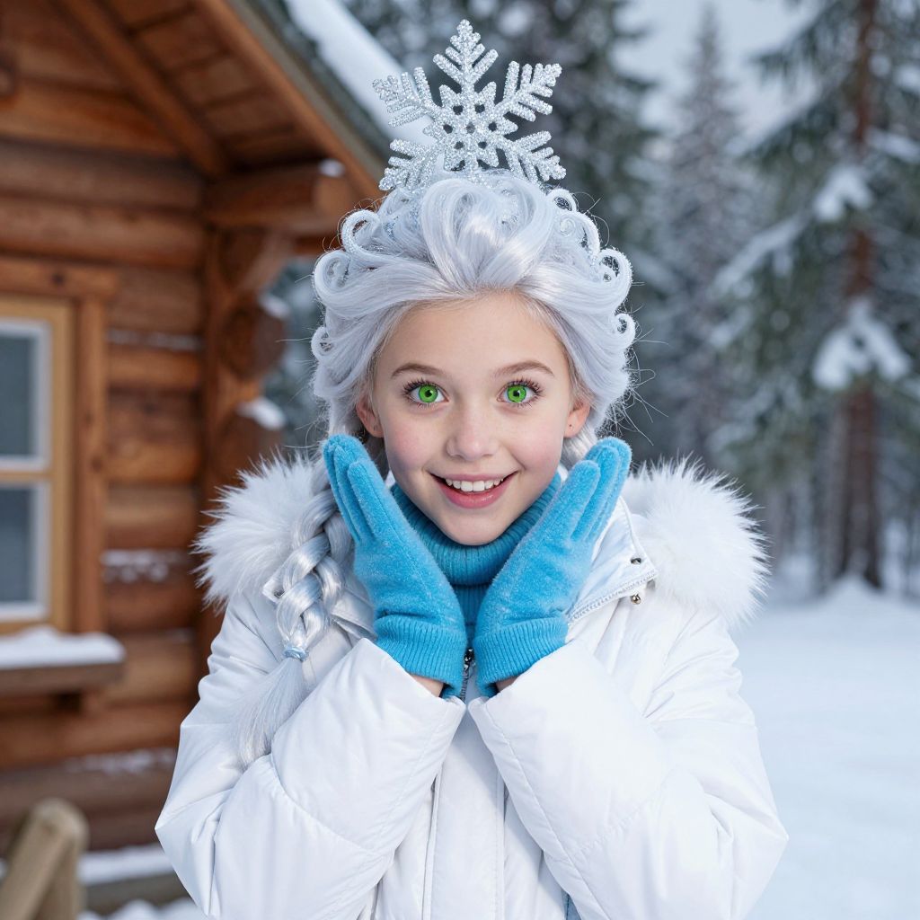 A playful girl with bright green eyes and a friendly smile, dressed in a vibrant frozen-themed costume complete with a white winter coat, blue gloves, and a sparkling snowflake headdress, her hair styled in a fluffy braid with a frozen hairstyle featuring soft, piled curls at the crown, standing beside a wooden cabin with pine trees in a snowy forest setting, captured in high-resolution, realistic studio lighting.