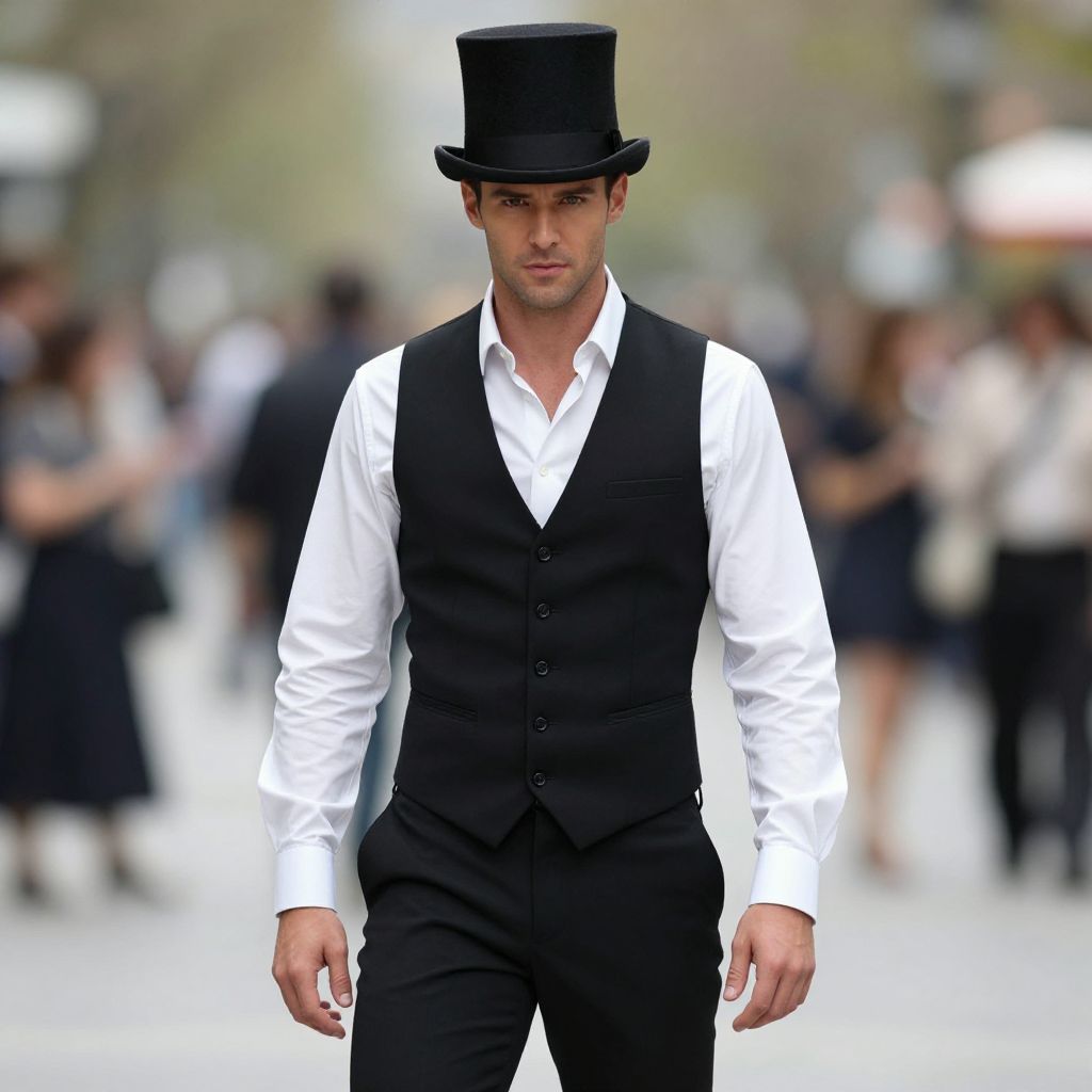 Photograph of a handsome man in a black top hat, white shirt, and black vest, walking confidently in a blurred outdoor crowd.