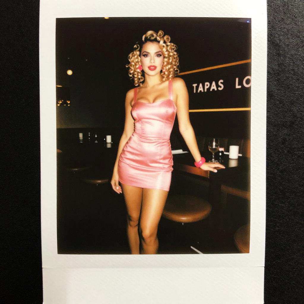 Photo of a Prominent Collarbone woman, Retro Curls, barbie outfit, pink mini dress with sparkly sequins, high heels, playful accessories, Tapas Lounge, polaroid instant camera