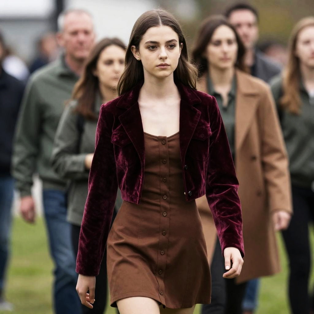 Young woman with straight brown hair, wearing a maroon velvet jacket over a brown, buttoned-up, corset-like dress, walking confidently. Background: blurred crowd, mixed ages, wearing green and brown clothing. Woman in foreground has neutral expression, others have varied expressions. Green grass and indistinct urban background. Photorealistic style.