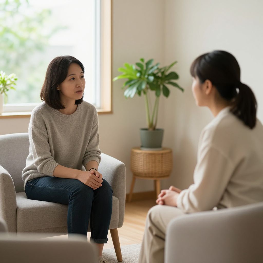 Photograph of two Asian women in a bright, modern living room, sitting in gray armchairs, engaged in conversation. One wears a gray sweater