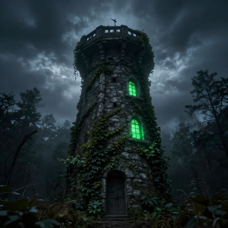 Creepy tower looms over a foggy forest at midnight, ancient stone covered in ivy, glowing eerie green lights in the windows, dark stormy sky, spooky atmosphere