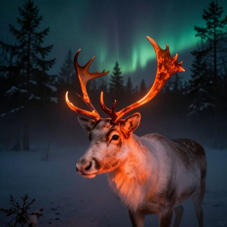 A high-quality photograph captures a white stag emerging from a black fog during a Nordic winter night, Only its head and shoulders are visible, glowing vividly under a striking orange-red light, Its antlers, like molten iron, radiate an intense, fiery hue that pierces the dark, The white fur shimmers faintly against the shadowy backdrop, while the rest of its form dissolves into the black fog, creating an eerie, surreal ambiance, The rest of the pine forest is barely visible, hidden in the surreal magical fog, Reminiscent aurora borealis light in the sky