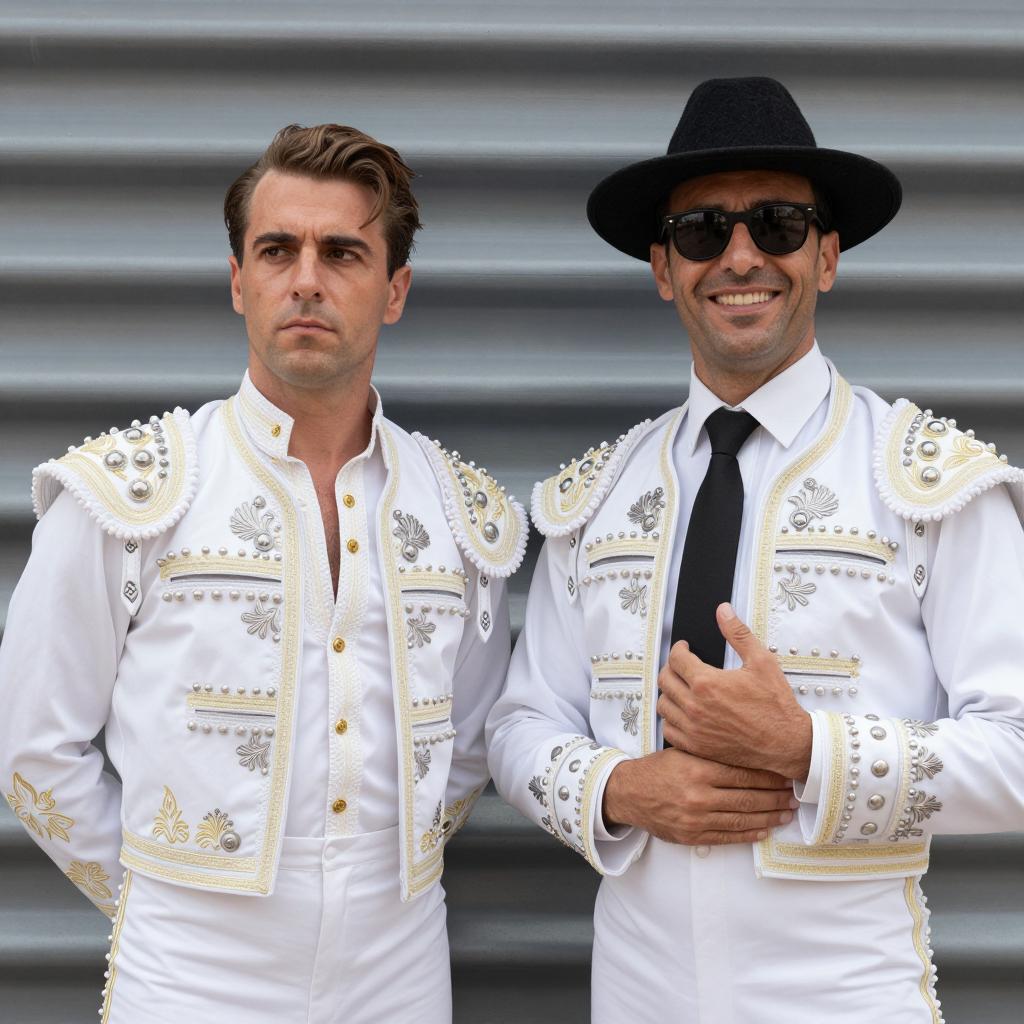 Two men in white traditional Spanish flamenco outfits with elaborate embroidery and silver studs. The man on the left has light brown hair, a serious expression, and looks slightly to the side. The man on the right has dark hair, wears a black hat and sunglasses, smiles broadly, and clasps his chest with his right hand. Background: gray metal wall.