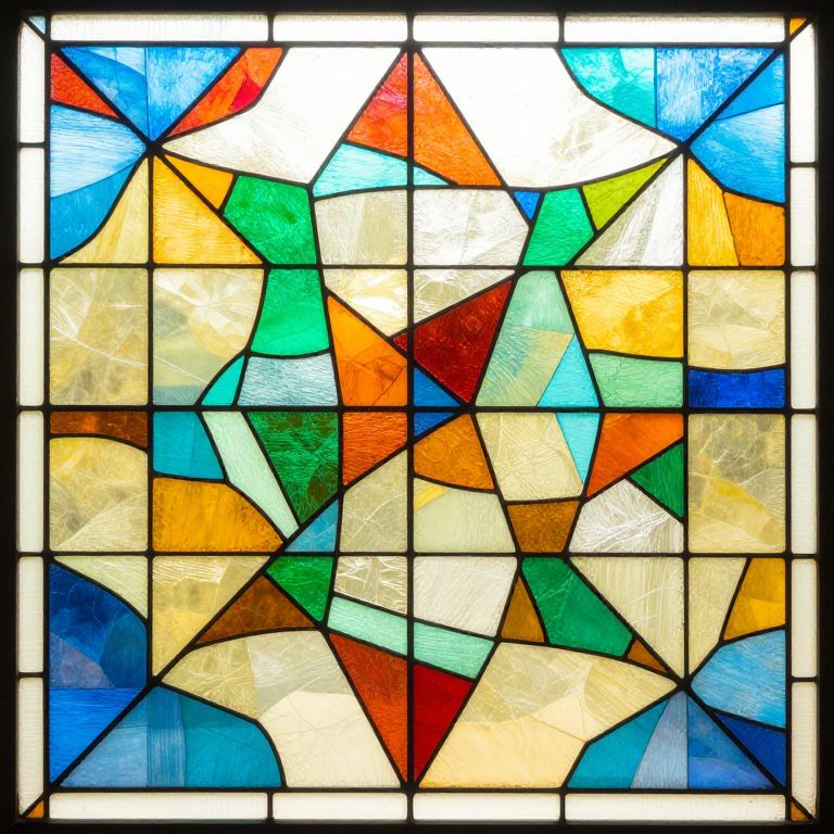 Vibrant stained glass window with a colorful, abstract pattern of triangles and squares in red, blue, green, orange, and yellow.