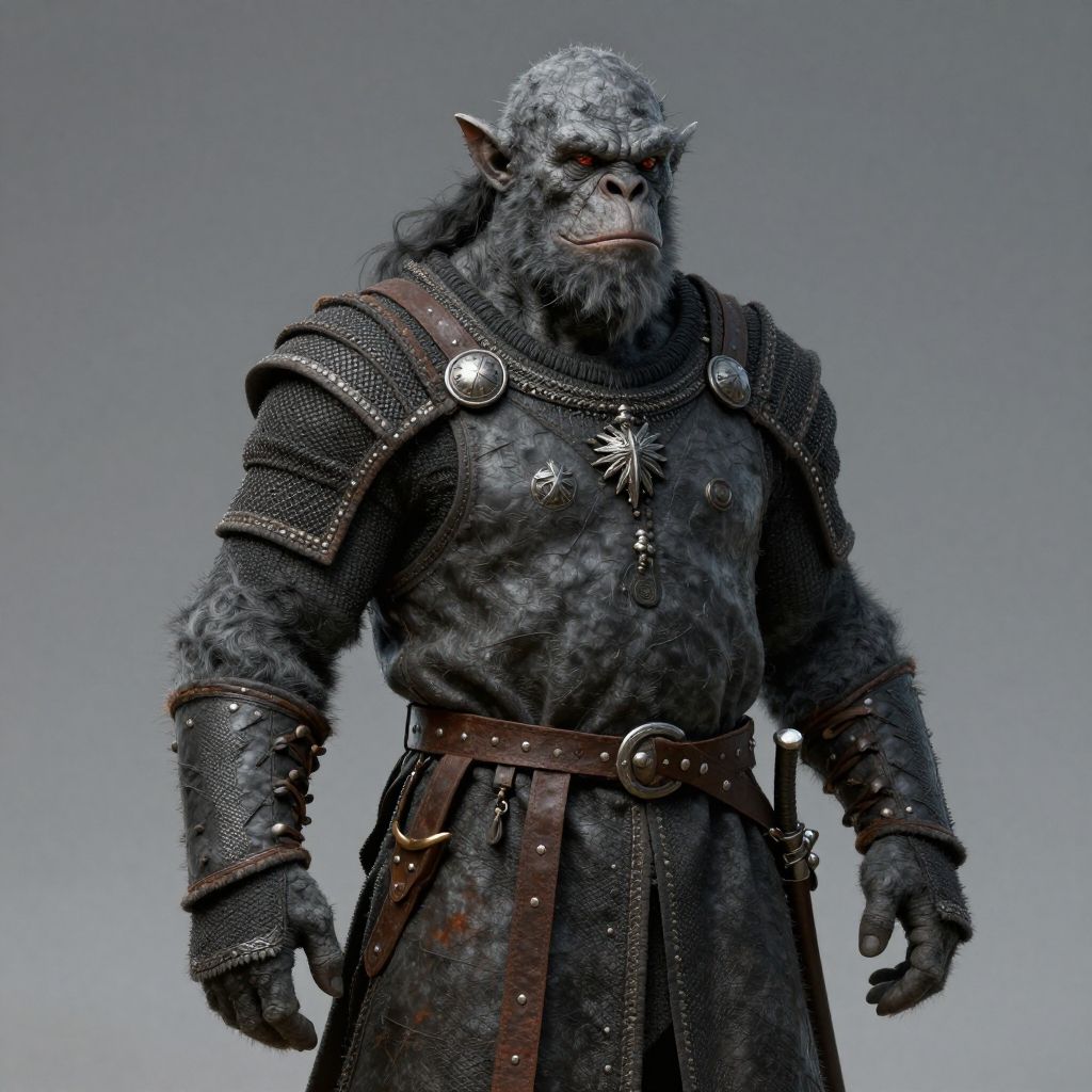 Photorealistic CGI image of a towering, muscular, anthropomorphic ape warrior. The ape has a grey, furry face with a stern expression, pointed ears, and a long, black beard. It wears medieval-style, dark, armored clothing with silver accents, including a chest plate with a sunburst emblem and a brown leather belt with a large buckle. The ape's arms and hands are covered in black, chainmail gloves. The background is a gradient of grey, adding focus to the character. The texture of the armor and fur is highly detailed, enhancing the realistic appearance.