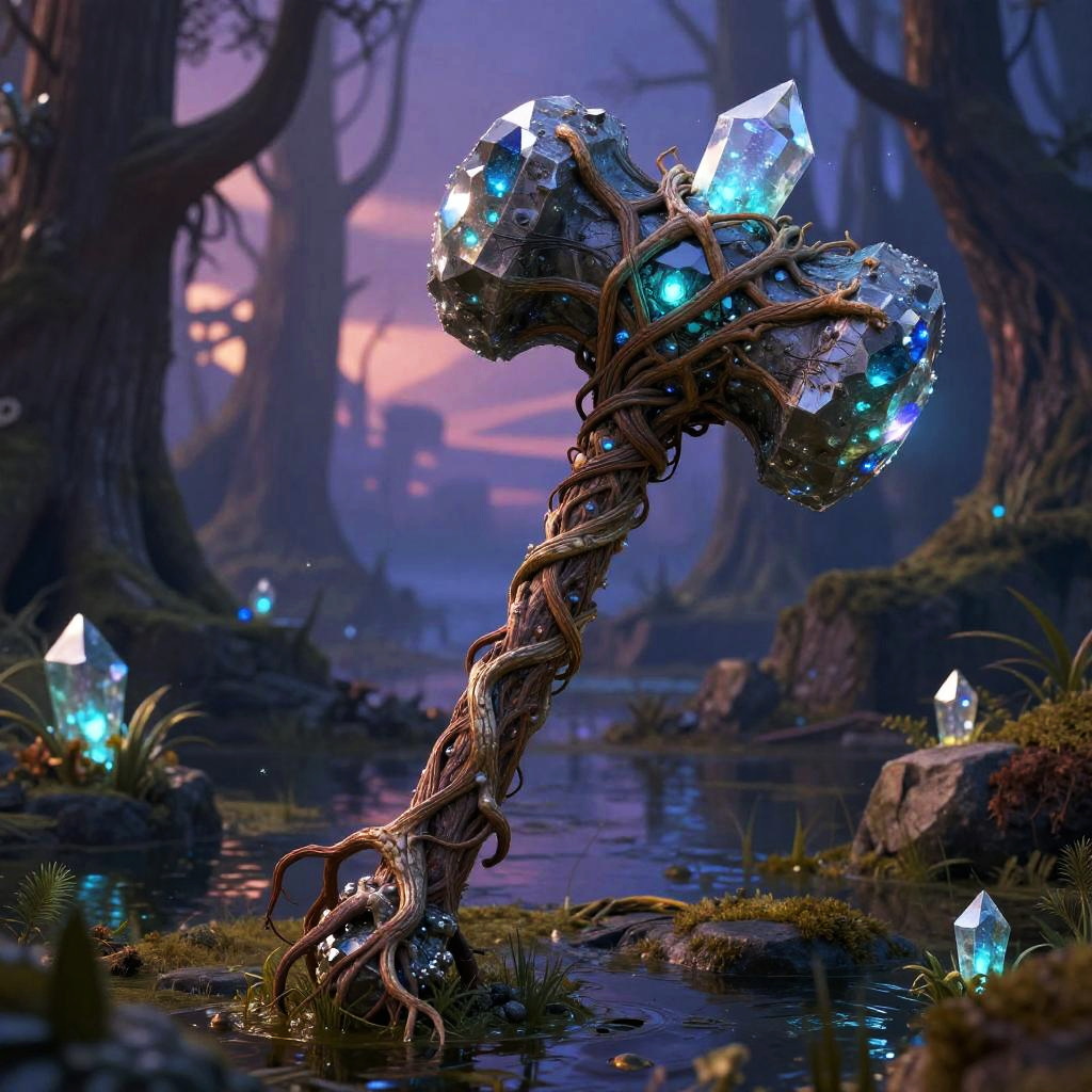 Epic Shrek weapon, a massive enchanted hammer made of twisted roots and glowing swamp crystals, emitting a mystical aura, fantasy environment with swampy trees, dusk lighting, highly detailed, vibrant colors
