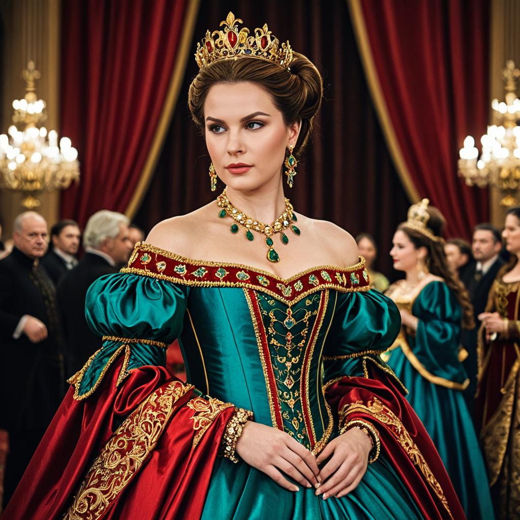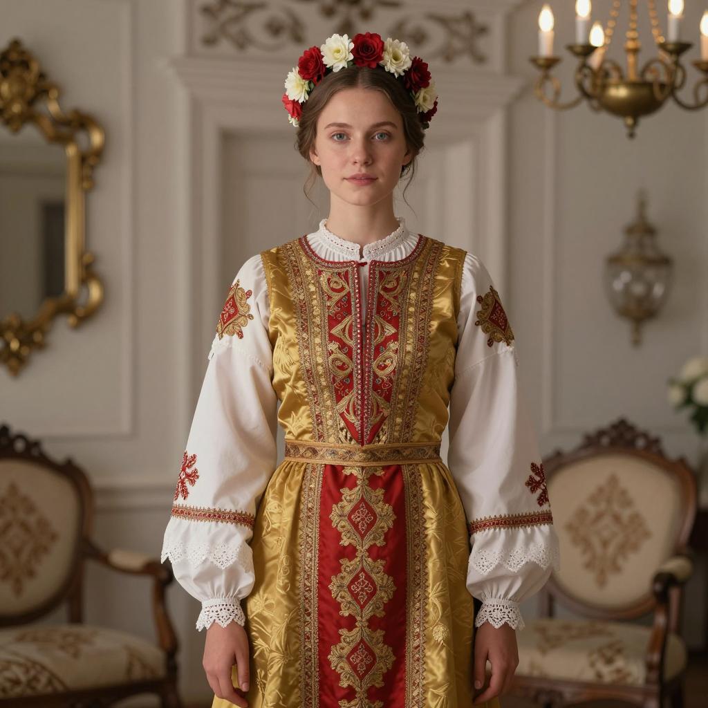 Traditional russian dress, photograph of a young woman with fair skin and brown hair in a traditional European folk dress, wearing a floral headpiece, standing in an ornately decorated room, detailed embroidery on dress, gold and red patterns, long sleeves with white lace cuffs, chandelier in the background, woman looking forward, soft lighting, realistic style, historical or period setting, detailed ures, high quality, slightly warm color tone, realistic photography, background blurred