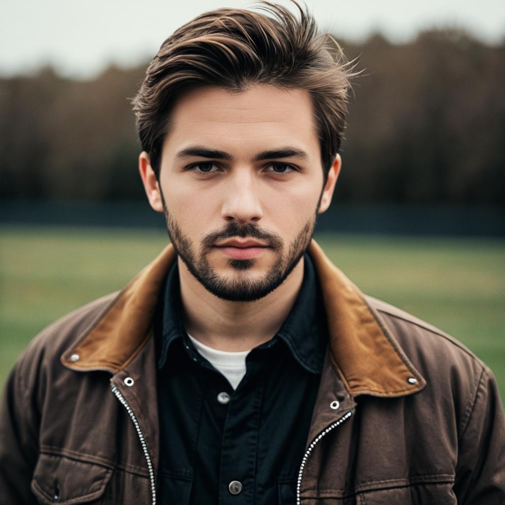 05d142b4b162fec599a2e2561419f56e creamfields,1boy, male focus, solo, realistic, shirt, upper body, facial hair, looking at viewer, t-shirt, red shirt, closed mouth, wheat, short sleeves, brown hair, short hair