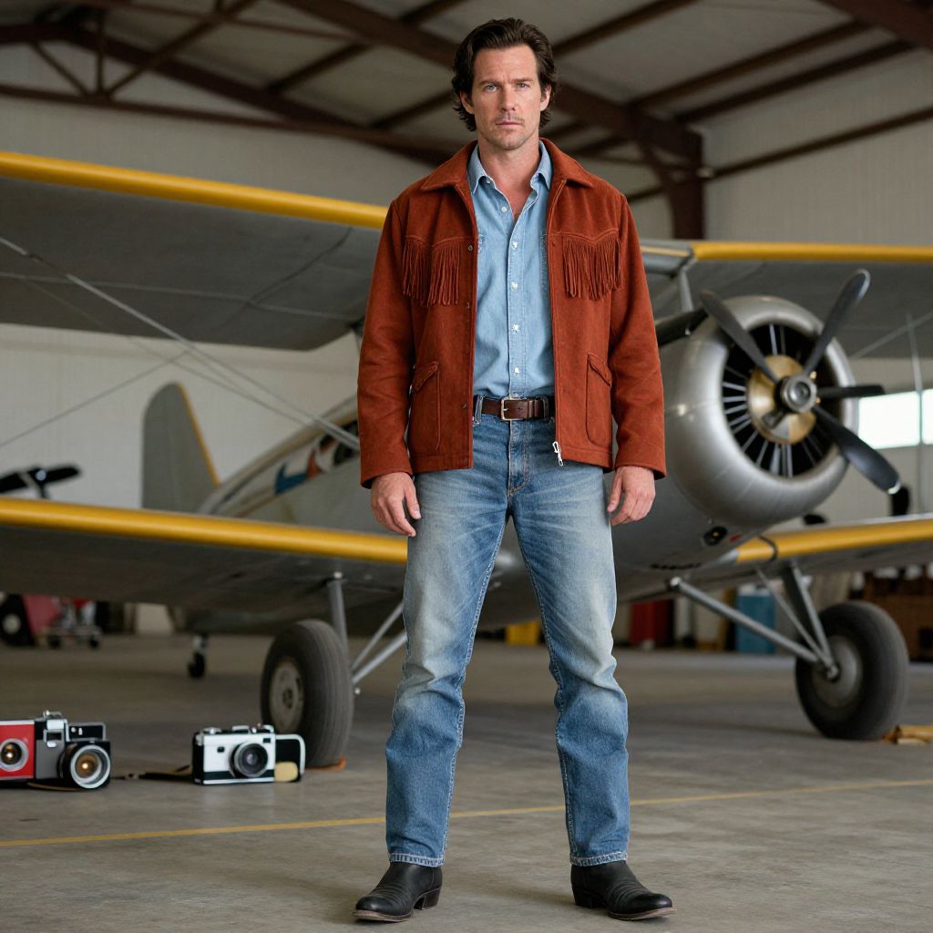 A man, rust-colored wool jacket with fringe, light blue chambray shirt, faded blue jeans, classic black cowboy boots, historic planes, hangar-style ceilings, aviation memorabilia, Holga camera style, soft focus, nostalgic tones, confident expression. Man has masculine face and piercing eyes