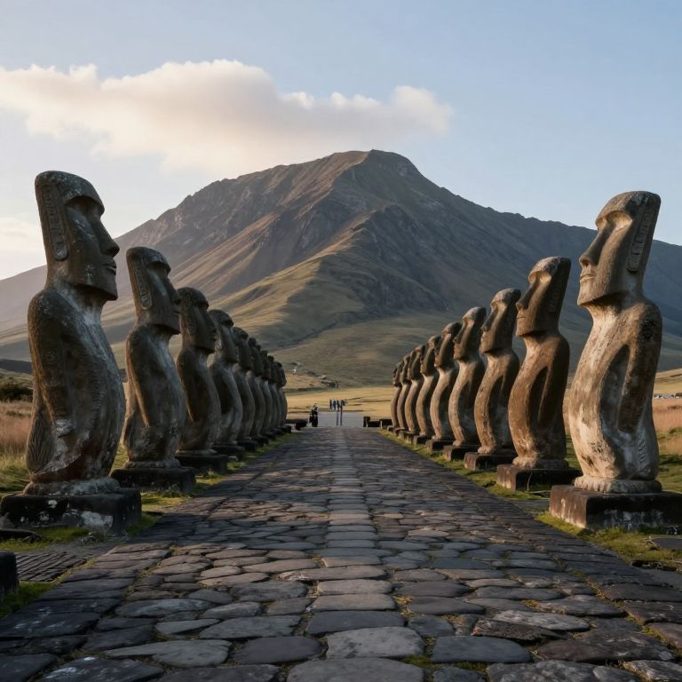 Photograph of a stone pathway lined with large, weathered Moai statues on Easter Island. The statues, with their elongated heads and distinctive profiles, are positioned on both sides of the cobblestone path, leading to a distant, majestic mountain under a blue sky with scattered clouds. The statues are dark gray, with textures showing age and erosion. In the background, small figures are walking along the path, adding a sense of scale to the monumental statues. The landscape features dry grass and a subtle gradient of green and brown hills.