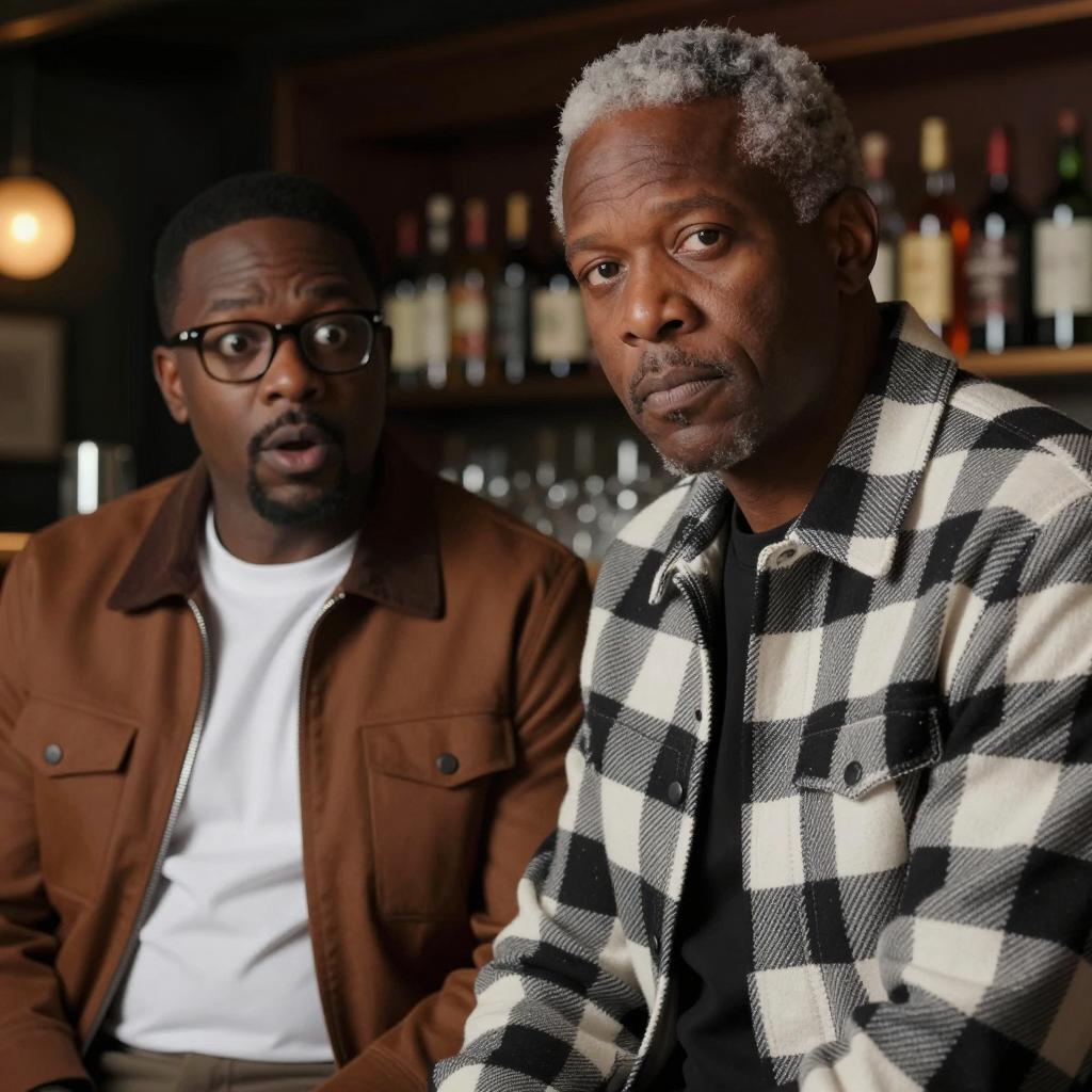 Two men in a red leather booth. Bald man in beige jacket, dark skin, smiling, leaning on the booth. Man with glasses, dark hair, wearing checkered shirt, gesturing with hands. Red and white checkered tablecloth, vase with orange flowers, silver condiments, napkin, and fork on table. Background includes wooden panel and green plants. Both men facing each other, engaged in conversation.