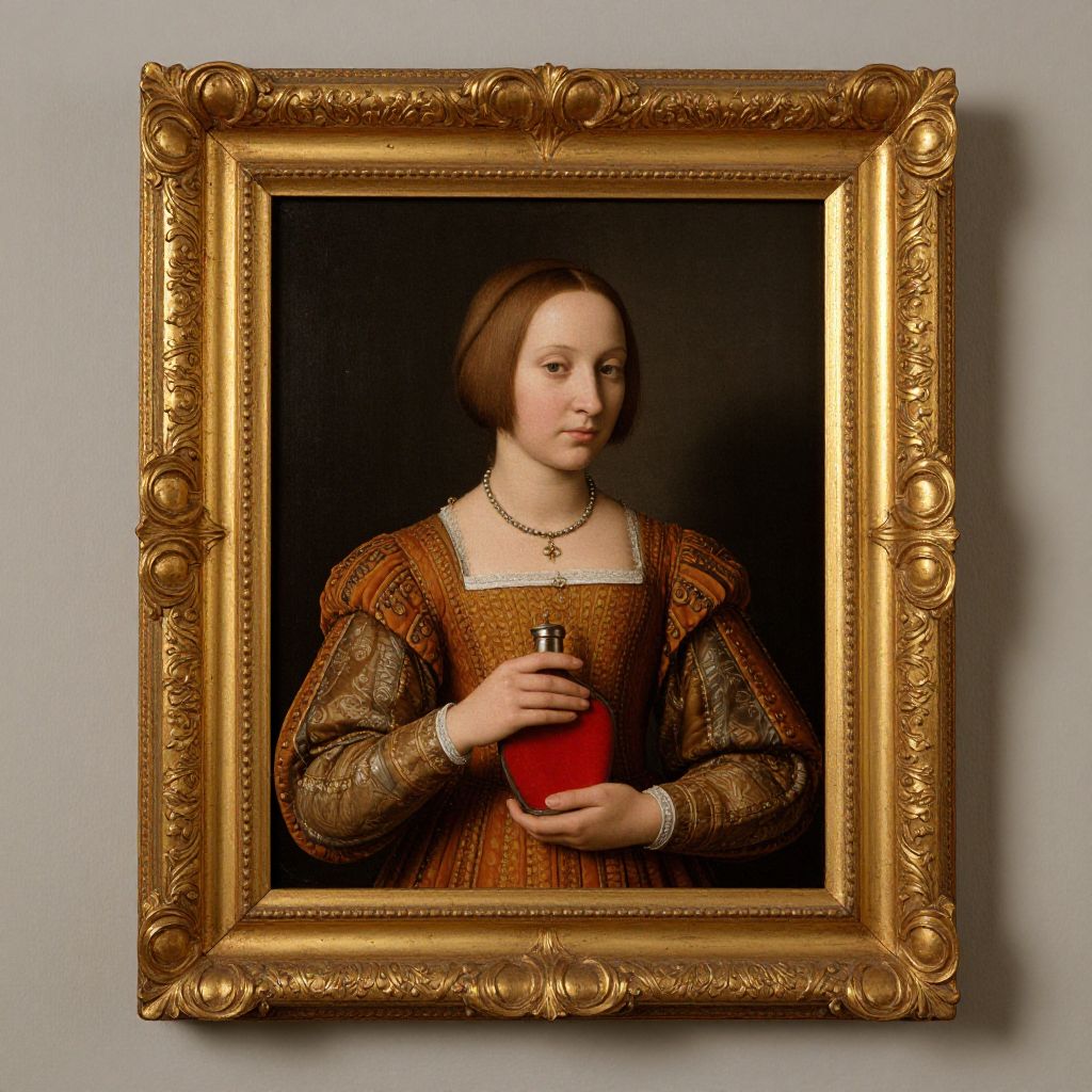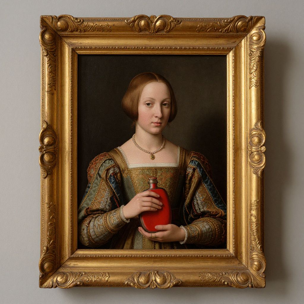 Exquisitely framed Renaissance portrait of a woman in period attire, holding a red flask, showcased within a golden ornate frame against a neutral wall backdrop.