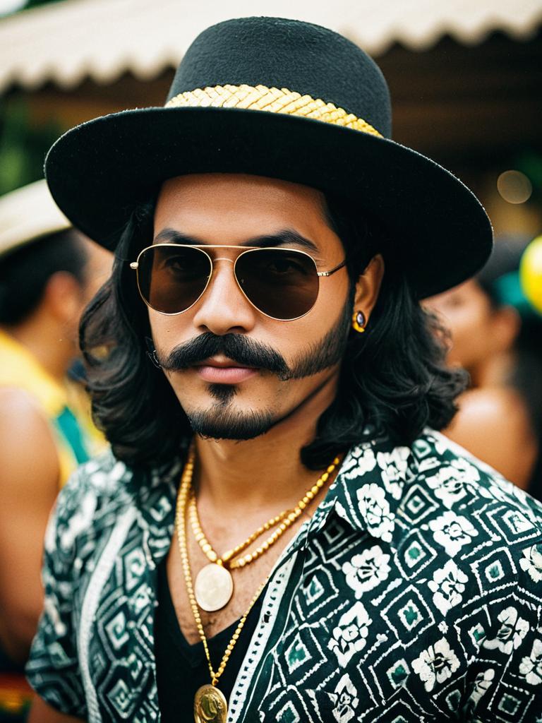 Brazilian themed party, 1boy, male focus, solo, sunglasses, black hair, hat, facial hair, jewelry, mustache, shirt, necklace, long hair, blurry background, looking at viewer, blurry