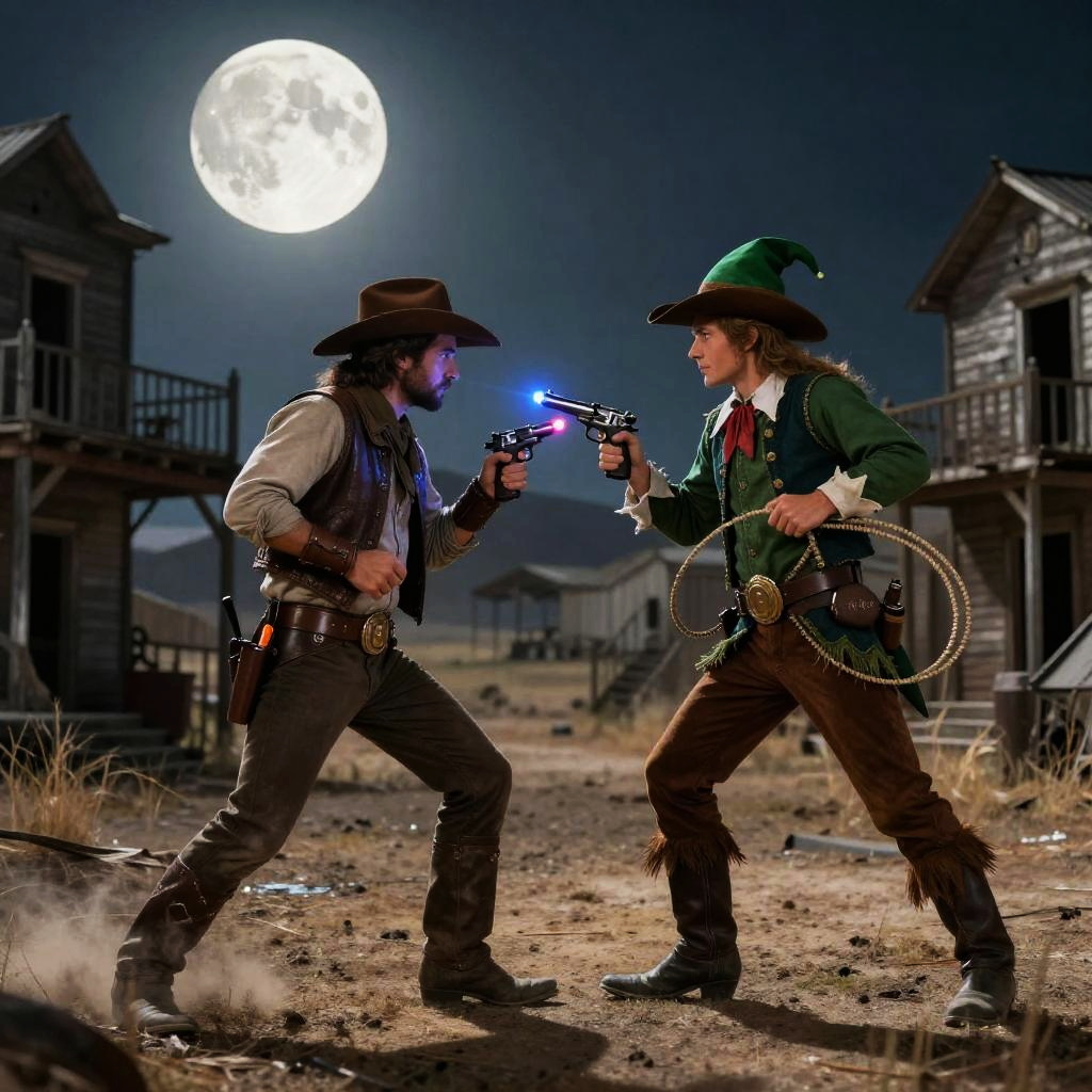 An elf cowboy dueling under a full moon in a forgotten ghost town, wielding a laser pistol and lasso, combining fantasy elements with classic wild west vibes, highly detailed environment