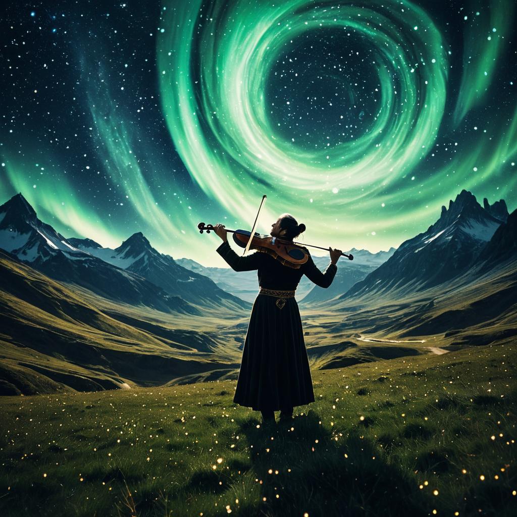A breathtaking celestial scene of a graceful cosmic bard in a radiant aurora-lit valley, surrounded by twinkling cosmic notes and swirling mystical winds for a serene and otherworldly atmosphere,