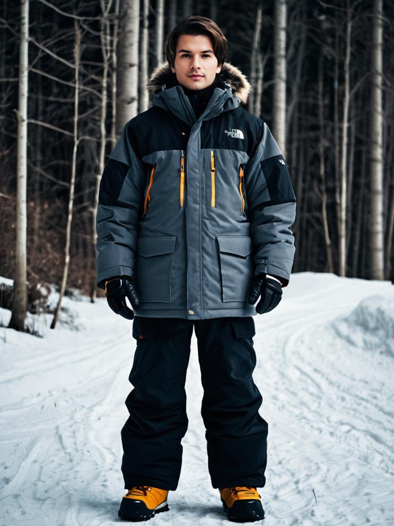 Northface coat costume, 1boy, male focus, solo, gloves, jacket, pants, black gloves, looking at viewer, coat, standing, realistic, full body, brown hair