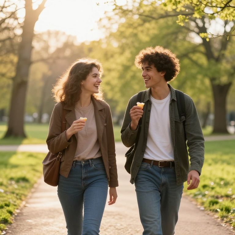 Photograph of four young adults with curly and straight black hair, sitting cross-legged on a grassy park, enjoying a picnic. They wear casual clothes—blue and white shirts, beige pants—and are eating large sandwiches. In front of them is a picnic blanket with a stack of pancakes, fruit, a basket of bread, and two cups of juice. Bright sunlight filters through lush green trees in the background, creating a warm, inviting atmosphere. The group is laughing and engaged, with a sense of joy and camaraderie.