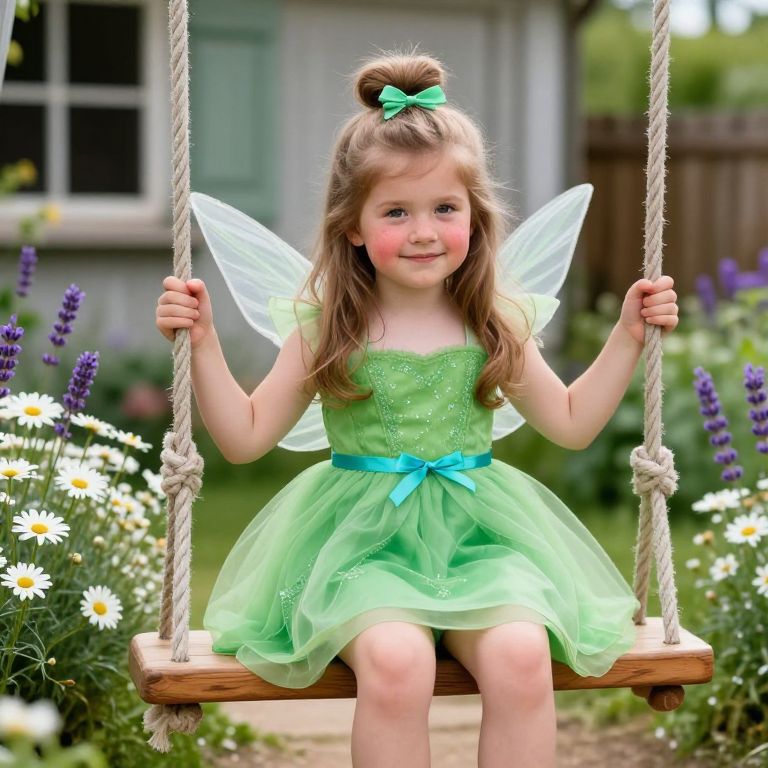 A girl with a cute round face, freckles, and rosy cheeks wearing a short green Tinkerbell dress with a tiny blue ribbon and sparkly embroidery, sitting on a wooden swing in a rustic cottage garden with daisies and blooming lavender, soft natural daylight, high detail photography