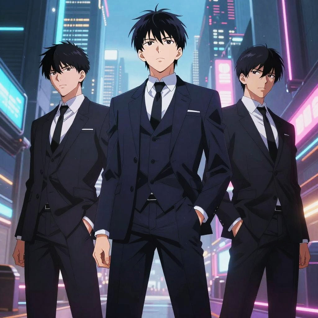 Anime characters wearing suits standing confidently in a futuristic cityscape, dynamic lighting with neon reflections, sharp details on suits, stylish and sleek design, expressive faces with intense eyes, highly detailed background in cyberpunk style.