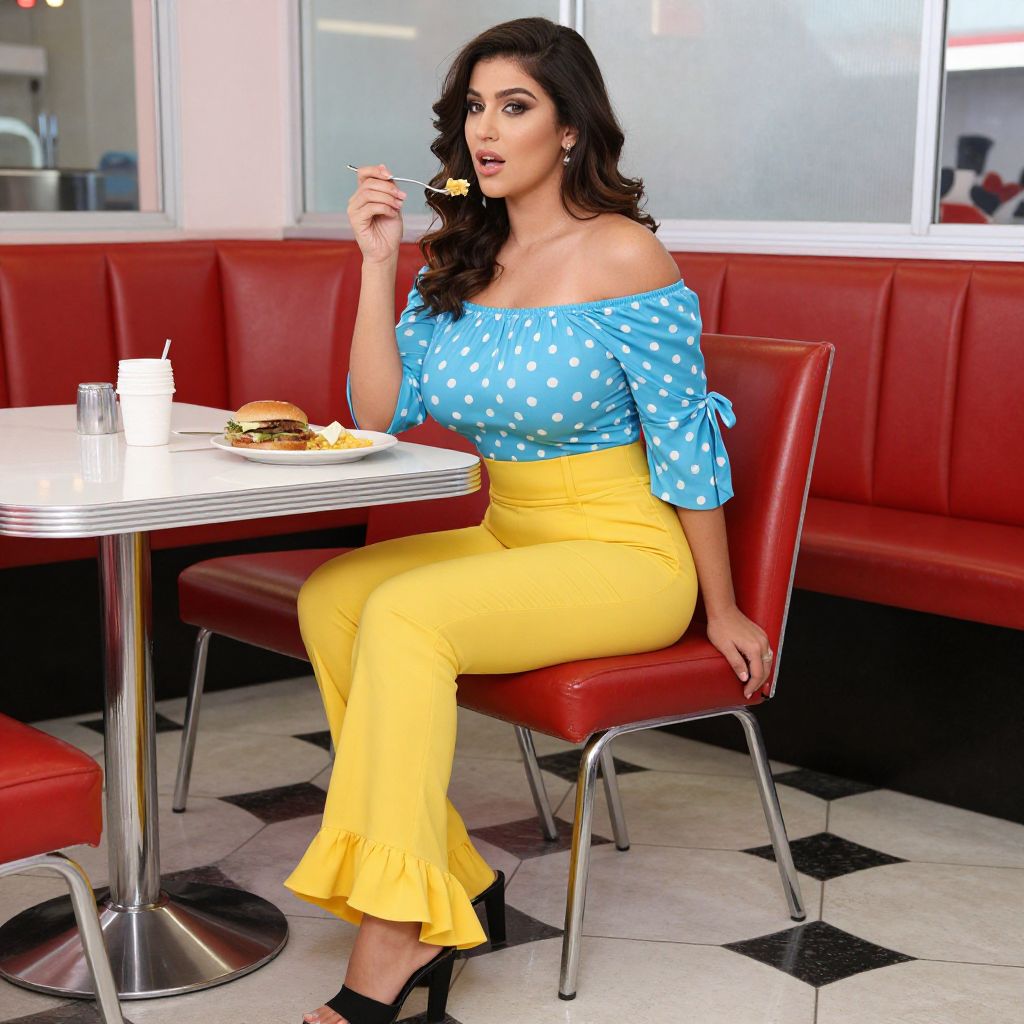 A woman, visual style: Pedro Campos, off-the-shoulder blue top with white polka dots, three-quarter sleeves with bow tie detail, high-waisted yellow flared trousers with a slight ruffle at the hem, black open-toe mule sandals, enjoying a meal at a retro diner. Sexy. Pretty face and beаutiful eyes. Big breasts