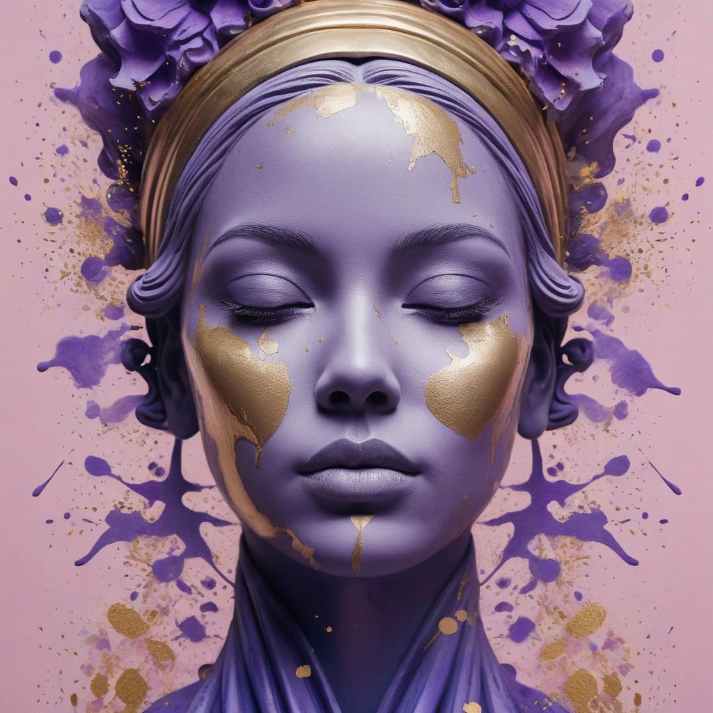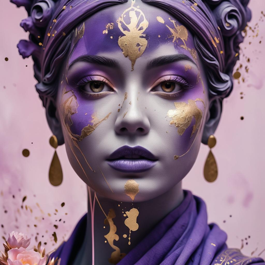 Artistic facial close-up of a female painter, deep eyes, perfectly symmetrical beautiful face, purple, gold, and silver ink splatters bloom like smoke fireworks and wrap around the statue like smoke, the background is pastel pink