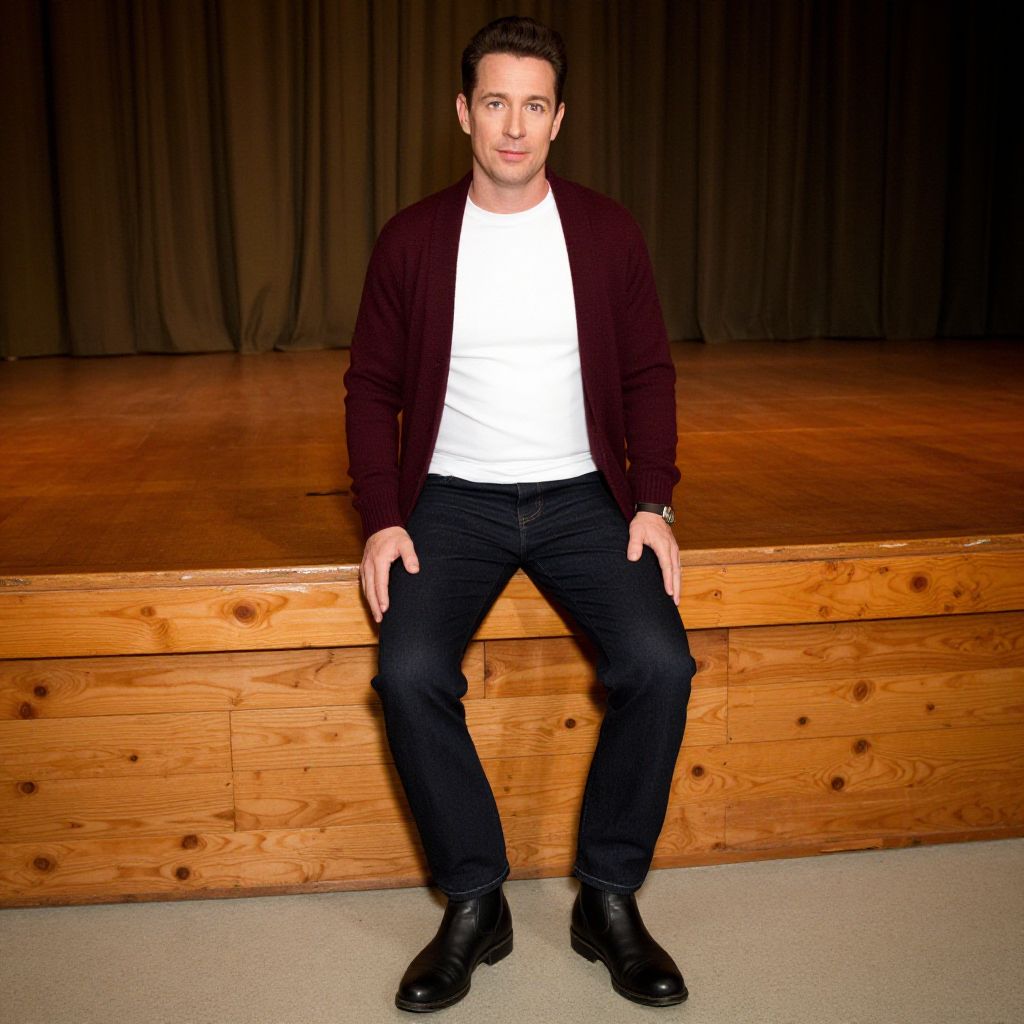 Photograph of a young, Caucasian man with short dark hair and a slight smile, sitting on a wide wooden stage platform. He is wearing a dark brown cardigan over a plain white t-shirt, black jeans, and black leather boots. His hands rest on his thighs. The background features dark brown, heavy curtains. The stage has a warm, natural wood texture. The lighting is even, highlighting his casual, stylish outfit and relaxed posture.