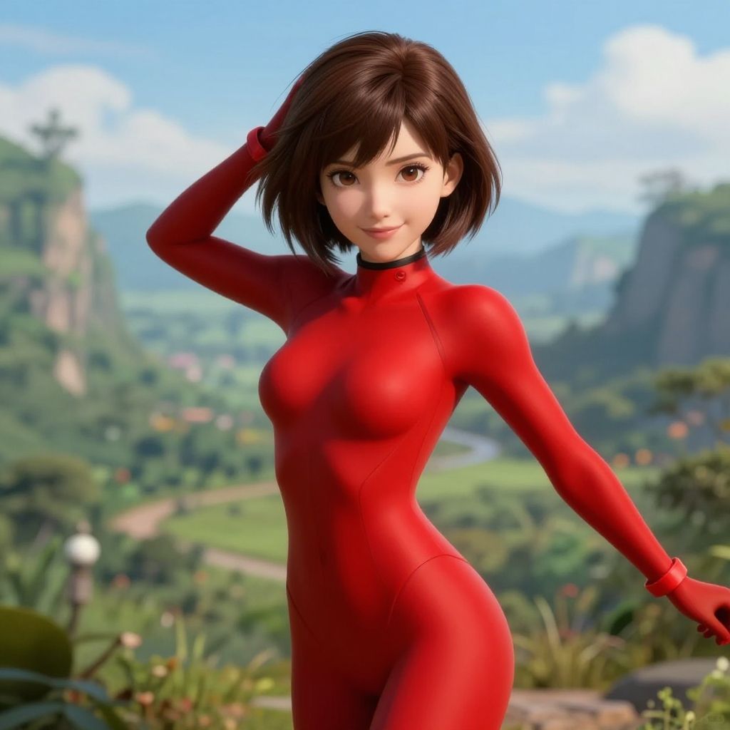 Photorealistic CGI of a young woman with short brown hair in a red and black metallic superhero suit, standing in a red field with mountains in the