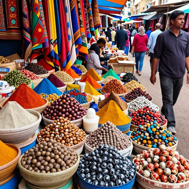 A vibrant market stall filled with multicolored bangels of different sizes and materials, captured in lively street scenes, bustling with motion and cultural elements like fabrics, spices, and patterns, bright natural daylight enhancing vivid colors.