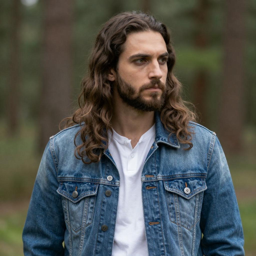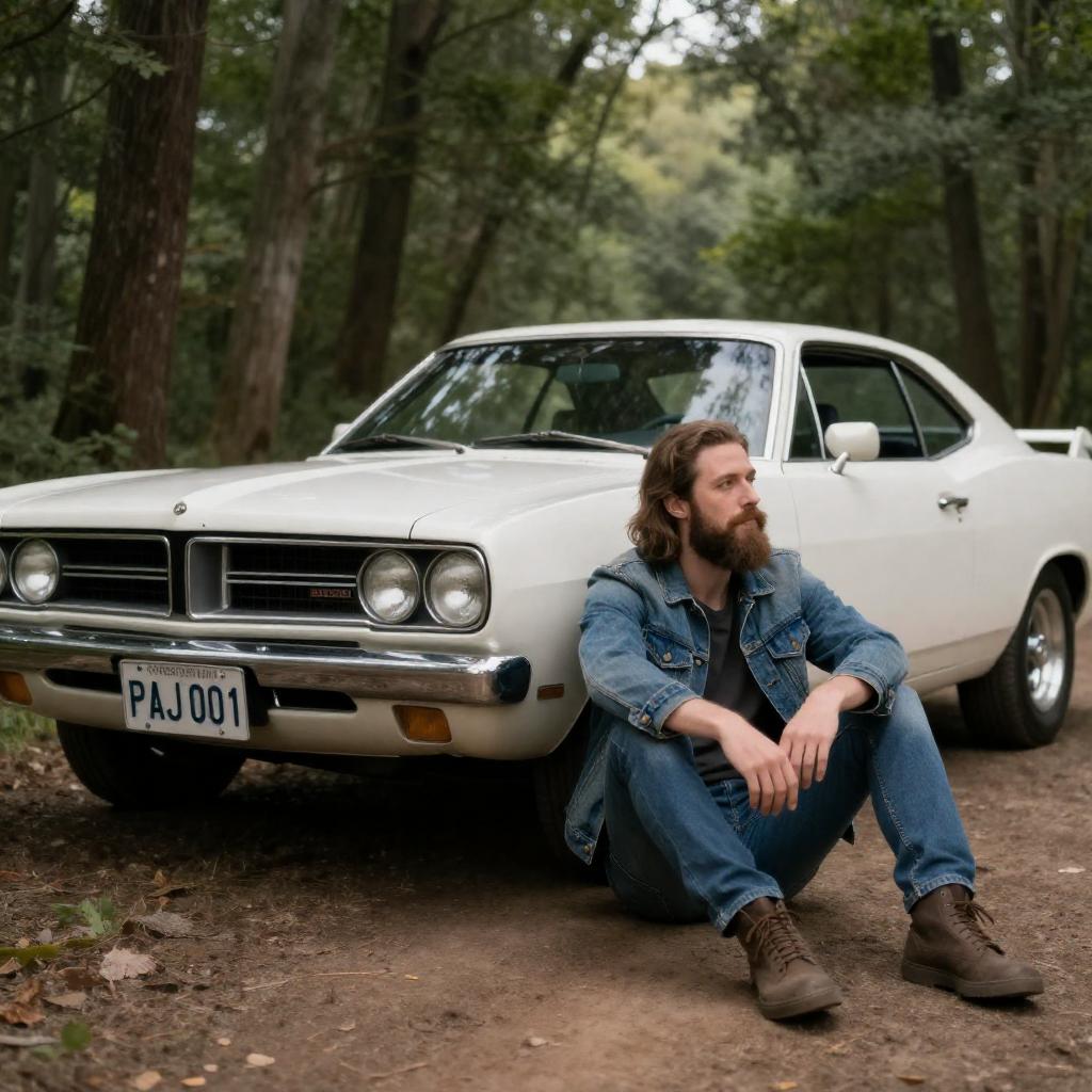 Photograph of a bearded man with long brown hair, wearing a denim jacket and jeans, sitting on a dirt path in front of a white Plymouth Road Runner car. The car is parked in a forest with tall trees. Sunlight filters through the trees. The man's hands rest on his knees, and he looks to the right. The car has a license plate reading "PAJ 001."