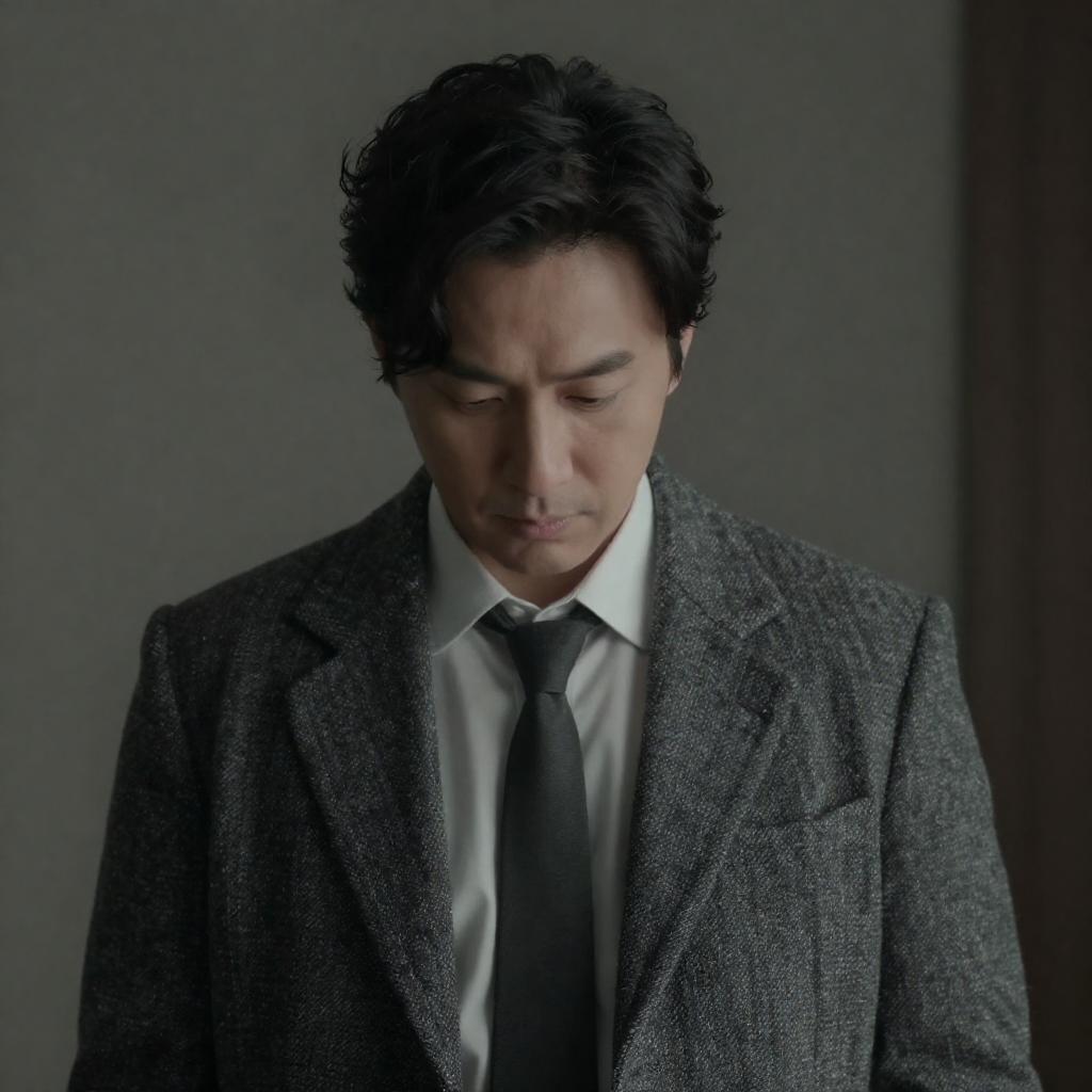Photograph of two people inside a wooden-paneled room. A man with dark hair, wearing a black suit, red tie, and white shirt, leans forward with his right arm resting on a chair. He has a serious expression. A woman with long brown hair, wearing a gray cardigan and red skirt, sits to his left, looking at him. The chair has a white cloth and beige rope tied around it. The background includes wooden walls and a blurred window.