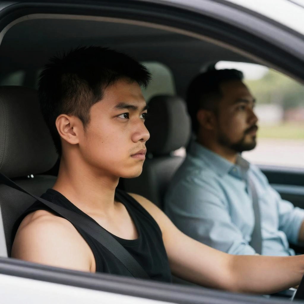 Photograph of an elderly man with glasses and a yellow cap driving a car, with a younger man with glasses and a brown suit sitting in the passenger seat. Elderly man in front, younger man behind. Car interior, daytime.