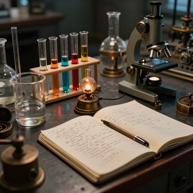 Paraphernalia of an old scientific laboratory: glass beakers, test tubes with colorful liquids, Bunsen burner, notebooks filled with handwritten notes, and a vintage microscope, moody lighting with cinematic color grading, steampunk vibes
