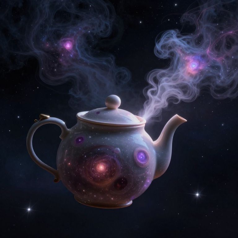 A giant teapot floats at the edge of the universe, spewing starlight steam that shapes nebulae into fantastical patterns as if painting the night sky.