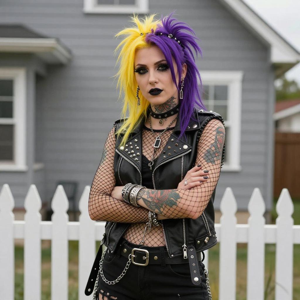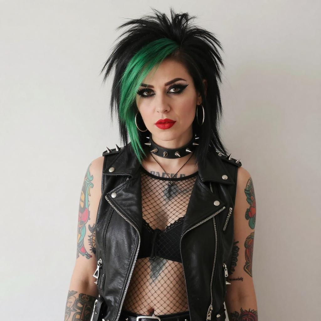Photograph of a punk woman with green-tipped black hair, heavy black eyeliner, and red lipstick. She wears a black leather vest adorned with spikes, a fishnet top, and a studded choker. Her arms are covered in colorful tattoos. She stands against a plain white wall, looking directly at the camera with a confident expression.