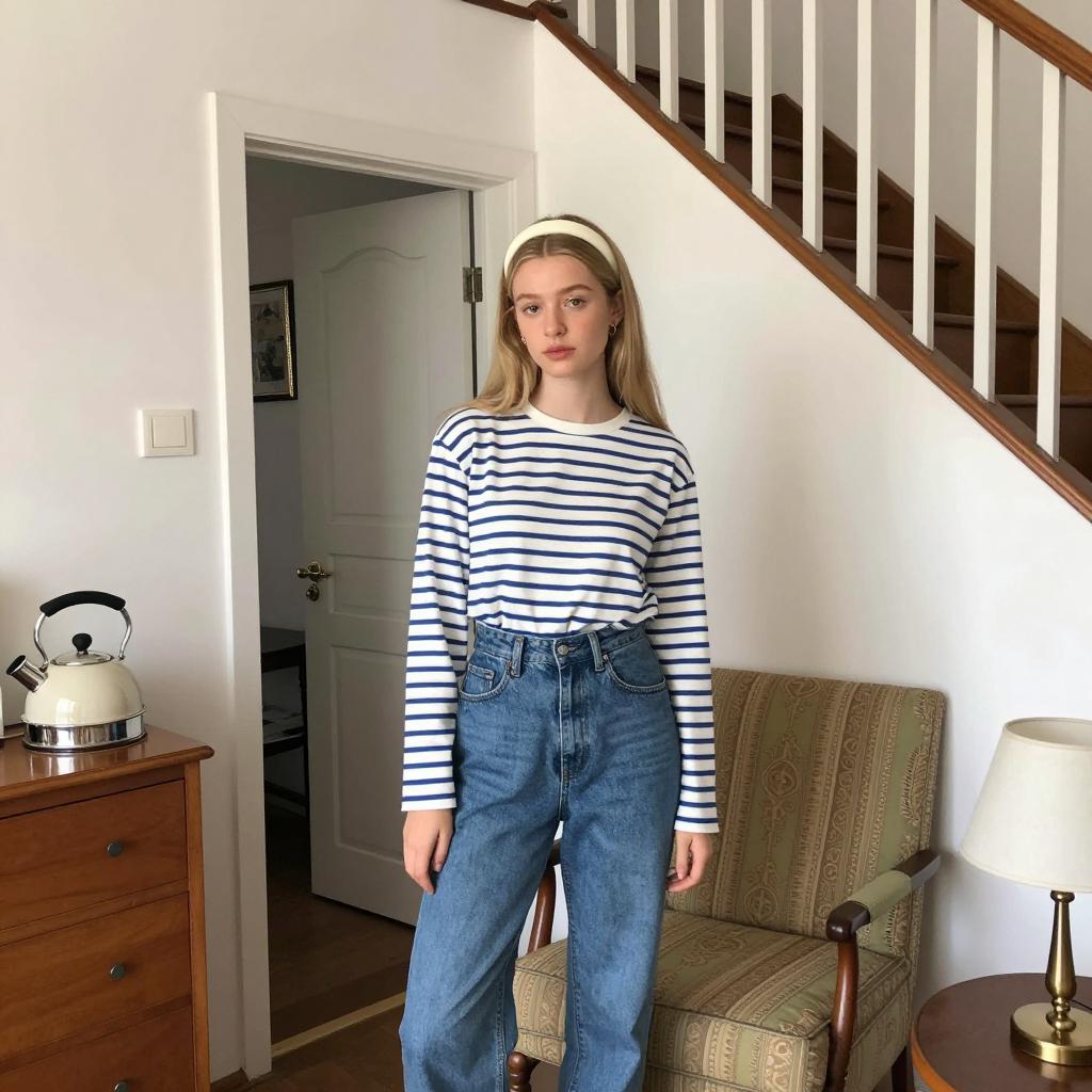 Young woman with long blonde hair, wearing a white and blue striped long-sleeve shirt and high-waisted blue jeans, standing in a white-walled room. She has a neutral expression, with a white headband in her hair. To her right, an armchair with a patterned fabric. To her left, a wooden dresser with a beige kettle. Behind her, an open door, white-framed stairs with wooden railings, and a framed picture on the wall. A lamp with a white shade is on a table in the foreground. One person. Casual setting. Realistic photograph.