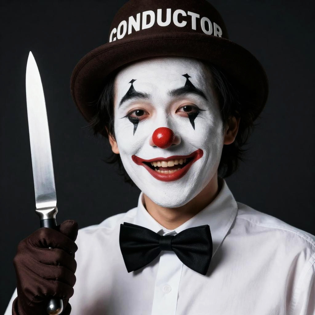 Photograph of a clown with a white face paint mask, black nose, and dark hair. Wearing a black bow tie, white shirt, and a brown hat with "CONDUCTOR" in white letters. Holding a silver knife with a brown-gloved hand. Dark background. Clown's mouth is open, showing teeth.