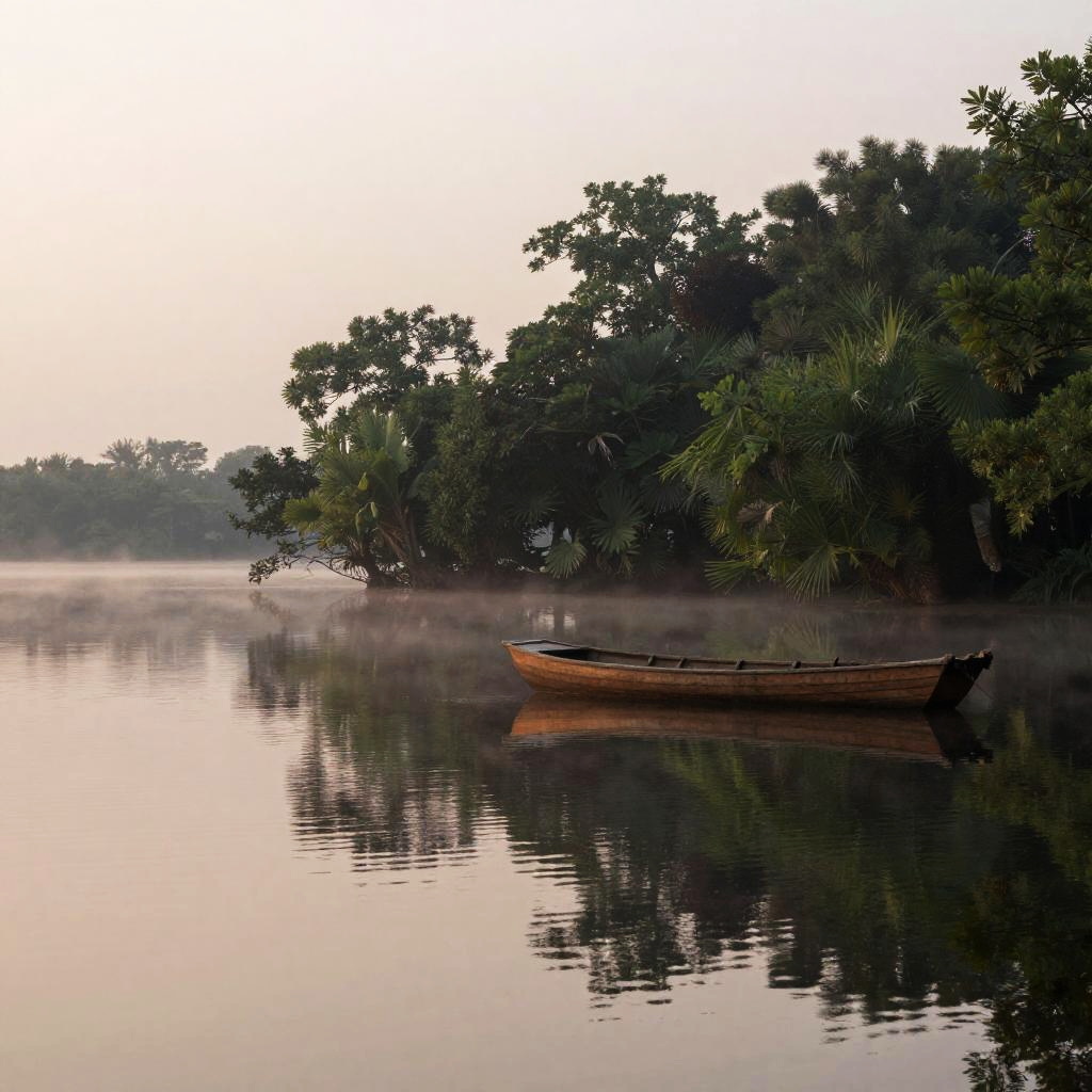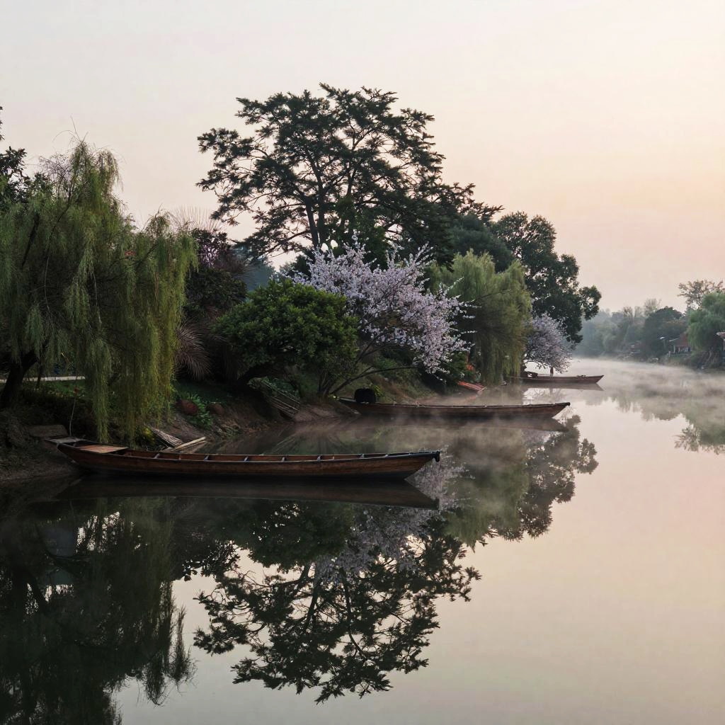 Tranquila scene of a serene lakeside at dawn, soft pastel colors reflecting on calm water, gentle mist rising, surrounded by lush greenery, a small wooden boat floating peacefully, evoking feelings of calm and quiet solitude.