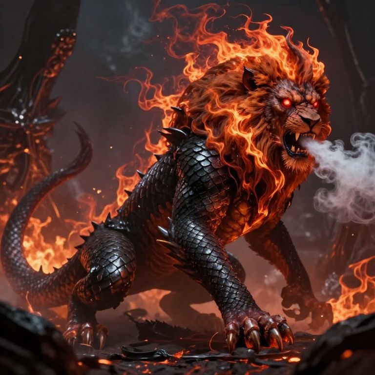 The image depicts a fearsome demon known as Shathariel, characterized by its serpentine body and lion-like head. Its fiery red eyes glow menacingly, set within a mane of flames that swirl around its head and shoulders. The demon's body is covered in black scales, as hard as steel, and it has a long, barbed tail that it uses to whip and lash at its victims. The demon's breath is a cloud of noxious gas that can choke and suffocate those who dare to get too close. Shathariel is said to dwell deep beneath the earth in the fiery pits of the underworld but has the ability to rise to the surface and bring chaos and destruction to the mortal world. It is incredibly powerful and almost impossible to defeat, with a gaze that can turn a person to stone and a roar that can shatter mountains. Some say that it is invoked by some to curse their enemies and make them fall into terrible luck.