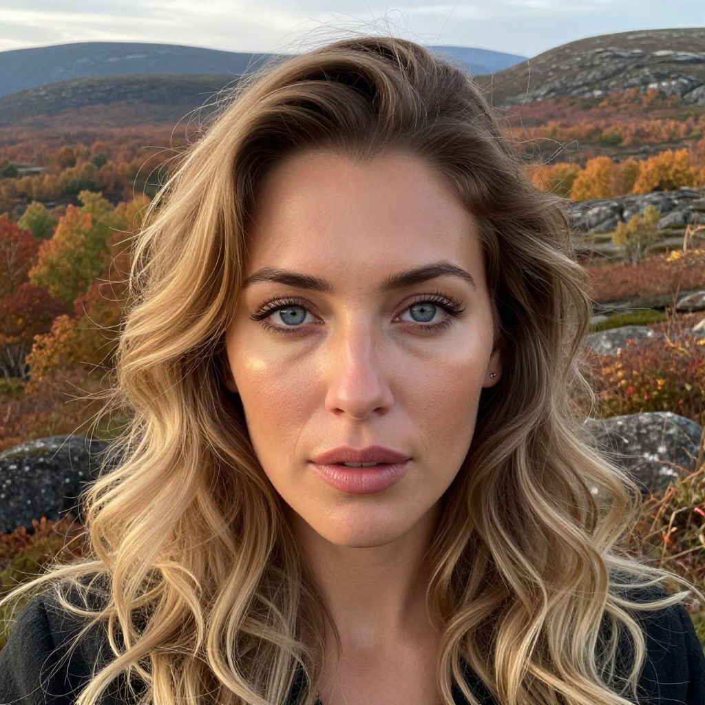 Craft a photorealistic portrait using an iPhone's camera, focusing on a Hispanic woman with striking blue eyes and wavy golden locks flowing over her shoulders. Capture her amidst a peaceful Scandinavian landscape bathed in soft autumn light, showcasing her intricate facial features, including high cheekbones and full lips, from an aerial perspective. The warm foliage hues reflect off her skin, creating an enchanting and introspective atmosphere. This portrait should evoke a sense of timeless connection with nature, capturing the essence of serenity and resilience.
