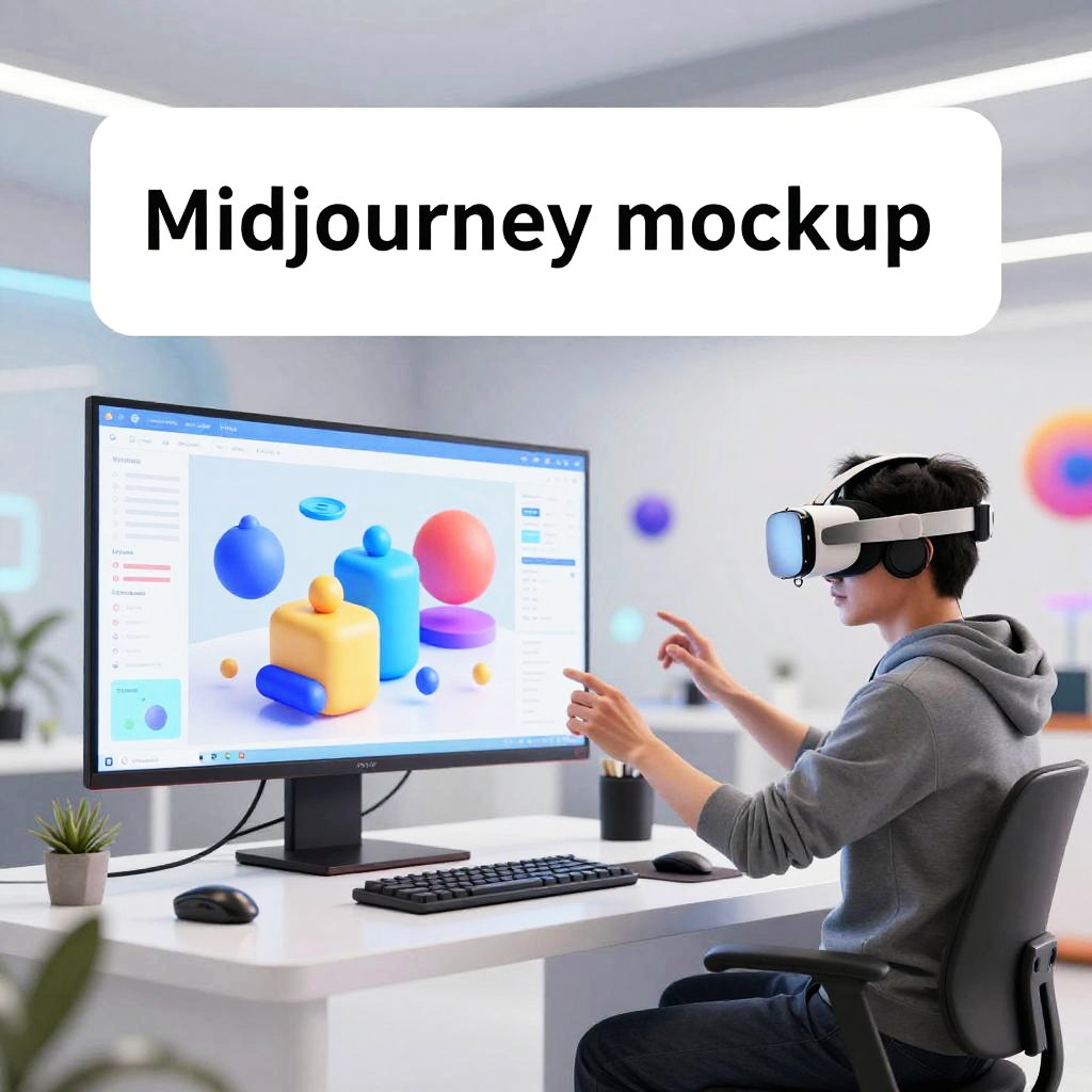 Photograph of a young man with short black hair, wearing a gray hoodie, black pants, and a white virtual reality headset, sitting at a modern, white desk in a bright office. He is interacting with a large computer monitor displaying colorful, abstract shapes on a white background. The desk has a black keyboard, mouse, and a small potted plant. The background is blurred with soft blue and pink lights. A white text box at the top reads "Midjourney mockup" in bold, black letters. The image has a clean, contemporary style with a focus on technology and virtual reality.