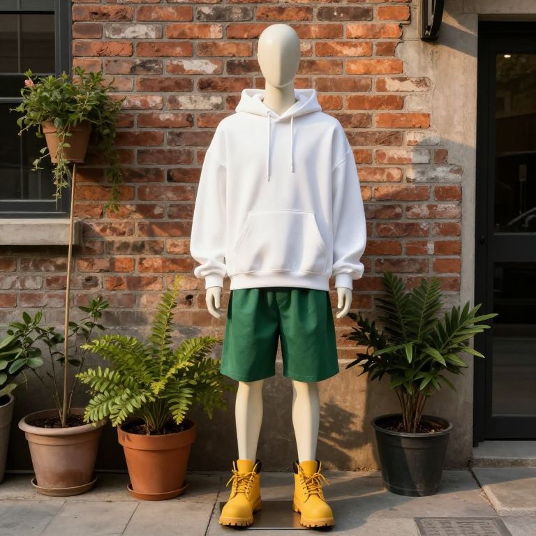 A detailed mannequin standing in a modern urban setting, wearing a stylish green hoodie with a slightly worn texture, a brown leather belt securing it neatly at the waist, and sturdy brown boots that add a grounded, practical touch. The mannequin has a sleek, minimalist design with smooth, reflective surfaces, and its pose is slightly angled to suggest movement and life, as if caught in a moment of stillness. Soft ambient lighting highlights the textures of the clothing and the material of the boots, creating a balanced, cinematic atmosphere. The background features a quiet city street at golden hour, with soft shadows and warm tones enhancing the overall mood.