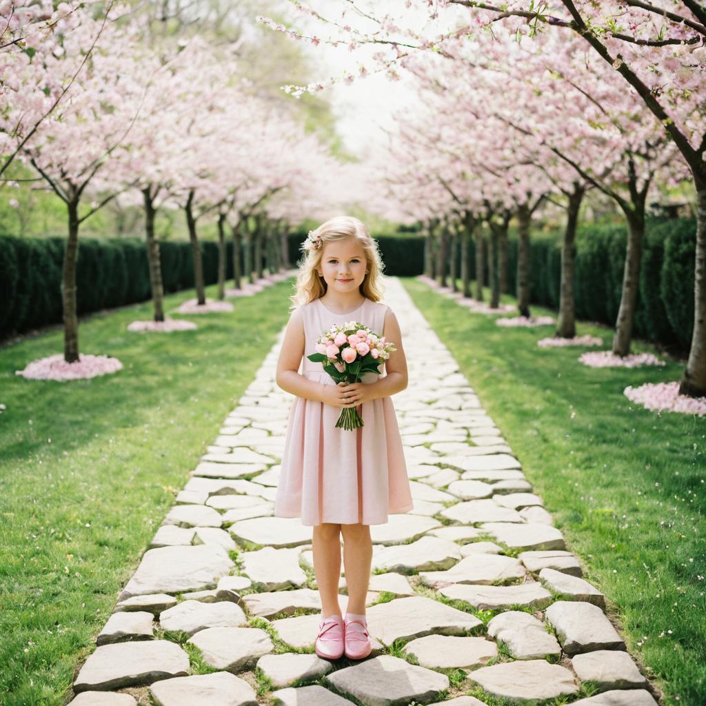 Junior bridesmaid dress, photograph of a young girl standing on a stone path in a garden, wearing a light pink sleeveless dress, holding a small bouquet of flowers, blonde hair in loose waves, pink shoes, pink cherry blossom trees on both sides, green grass and small white flowers lining the path, sunny day, soft lighting, girl looking directly at camera, serene and peaceful atmosphere, natural and romantic style