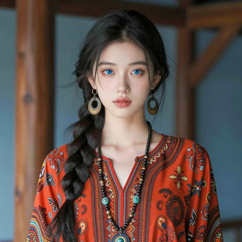Young woman with fair skin, blue eyes, and long black hair in a loose braid. She wears a red-orange patterned blouse with intricate designs, large circular earrings, and a beaded necklace. Wooden beams and blue background in the background. She stands with a neutral expression, looking directly at the camera. Photographic image.