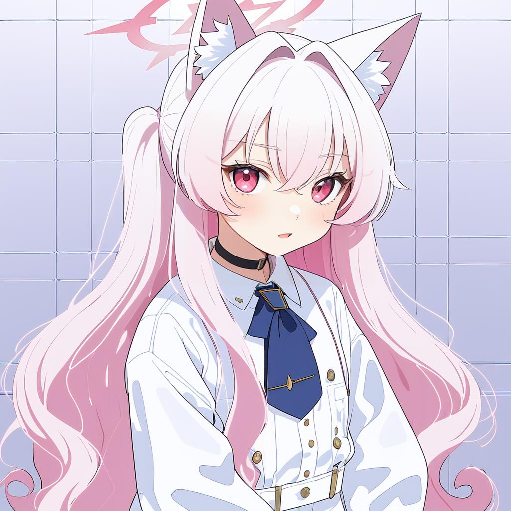 Akira (blue archive), blue archive, 1girl, cat girl, cat ears, animal ear fluff, cat tail, red eyes, hair between eyes, colored eyelashes, long hair, white hair, pink hair, white shirt, white gloves, white pants, halo, pink halo, long sleeves, black choker, by artist nishizuki shino, anime