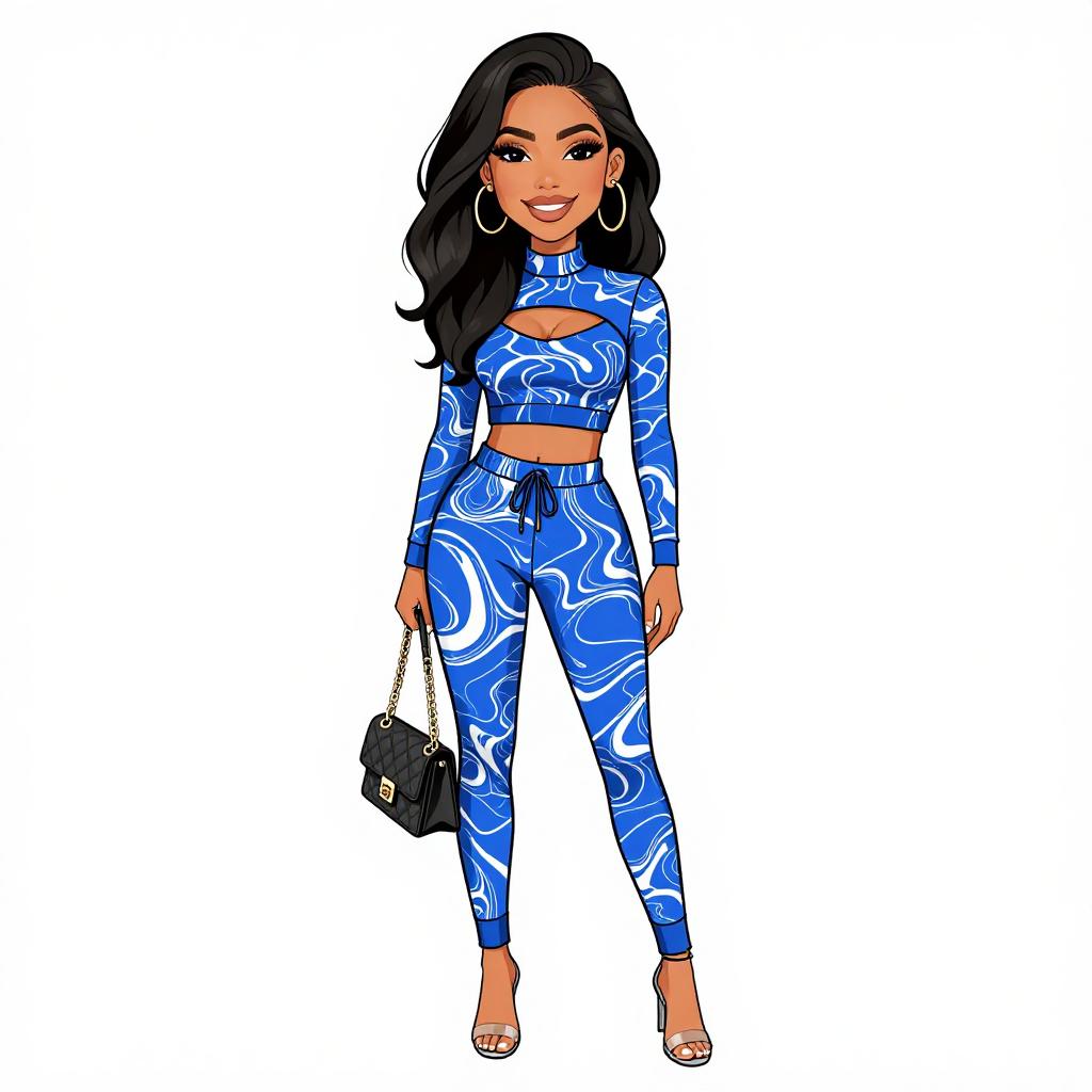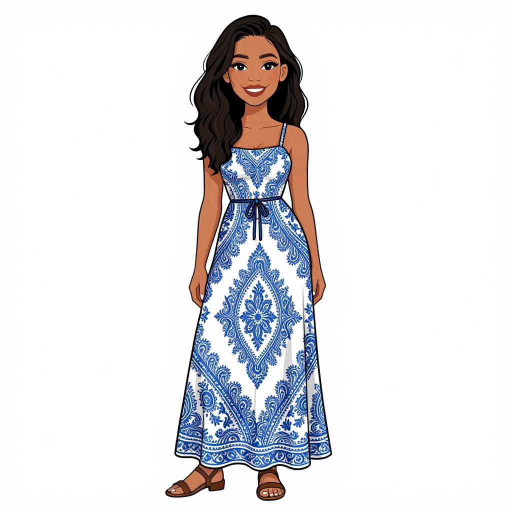 Woman with pretty face and pretty hair. smiling Woman, bohemian, cream crochet halter top with fringe detailing, layered gold necklaces, high-waisted flowy maxi skirt with blue and white paisley print, gold cuff bracelet, white studio background. --sref 1467