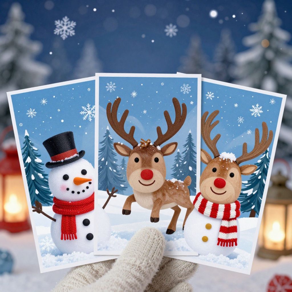 Insert face Christmas cards designed with whimsical winter wonderland backdrops, faces inserted into playful snowmen and reindeer characters, bright colors and sparkling snowflakes, cartoon style meets realism, cozy mittens and scarves, soft glowing lanterns, magical holiday spirit captured vividly.